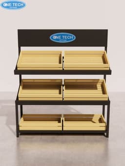 Manufactured in Vietnam for grocery and fresh-food retail, this 3-tier produce rack combines a powder-coated steel frame with wooden trays to present fruits and vegetables neatly at shopper-friendly height; the integrated top bar supports branding or product information signage, making it a practical fixture for retailers and distributors sourcing durable in-store displays.