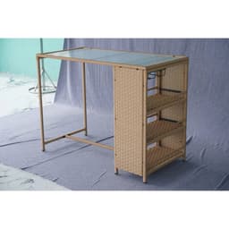 Elevate outdoor entertaining with this 5-piece bar-height rattan set—built for patios, poolside areas, garden lounges, and hospitality projects. Manufactured in Vietnam for export sourcing, the set includes a tempered glass-top bar table and four cushioned bar stools, crafted with handwoven PE rattan over a durable powder-coated steel frame for long-lasting performance. Integrated side shelving and under-table wine glass holders add practical storage for commercial and residential outdoor spaces.
