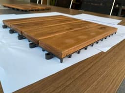 Interlocking deck tile in a 4-slat layout, designed as a cost-effective modular flooring option for balconies, patios, bathrooms, gardens, and seasonal display projects. Made in Vietnam using acacia wood with a plastic base, oil finished, and offered in trade-ready MOQ terms for wholesale sourcing.