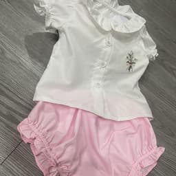 The KIVIA-2033 Bloomer Set is a premium 2-piece baby girl clothing set featuring a short-sleeve white top with ruffled round collar, front buttons and delicate floral embroidery with a soft pastel bow, paired with pastel pink bloomers finished with gentle elastic and ruffled hems; made from a soft cotton-rayon blend that is breathable, skin-friendly and lightly stretchy, this Spring–Summer set offers a refined, elegant alternative to printed designs, ideal for daily wear, outings or special occasions, available in sizes 6M–24M with Middle East fitting, MOQ 600 pcs per design, multiple pastel color options, and full OEM/ODM customization for international buyers targeting markets such as Dubai, Qatar and Saudi Arabia.