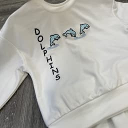 The KIVIA-3027 Dolphins Sweat Suit Set is a premium 2-piece baby and toddler clothing set made from a soft cotton blend fleece that is warm, breathable and sweat-absorbent, featuring a long-sleeve sweatshirt with cute embroidered dolphin graphics and vertical “DOLPHINS” text, ribbed cuffs and hem, paired with elastic-waist jogger pants for all-day comfort and flexibility; designed for Autumn–Winter collections, this unisex set is suitable for daily wear, available in sizes 12M–36M with Middle East fitting, MOQ 600 pcs per design with 3–4 colors available, and offered under OEM/ODM production for international buyers and wholesalers.