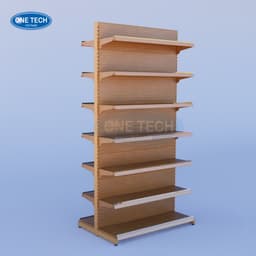 Designed and produced by One Tech in Vietnam, this double-sided wood-grain supermarket shelving system is built for retail chains, minimarts, and showroom rollouts that need a durable, high-load gondola solution with a premium wood-look finish; it offers configurable bay lengths/heights, selectable back panel styles (solid or perforated), and up to 80kg per shelf level to support everyday merchandising in high-traffic stores.
