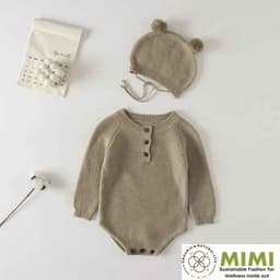Made in Hanoi, Vietnam, this cute unisex baby set features a soft knitted romper with full sleeves and snap-button closure for easy changing, paired with a matching hat in a classic knit style—available with OEM/ODM service for international brands, importers, and distributors sourcing Vietnam-made organic baby apparel.