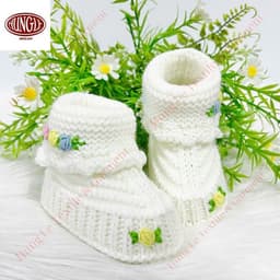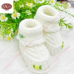 Cozy baby booties featuring delicate floral embroidery and a snug ribbed cuff, made in Ho Chi Minh City, Vietnam for breathable, washable, anti-wrinkle daily wear; suitable for international sourcing/export with OEM/ODM accepted, custom sizing, customer logo support, and flower color customization (MOQ can be bundled with apparel orders), with sample time 7–10 working days and delivery typically 7–15 days depending on order volume.