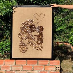 Made in Vietnam, this original hand-made decorative wall artwork features natural coconut shell material mounted on a wood support base with an elegant frame, offering a distinctive eco-friendly statement piece for interior décor sourcing (home décor retailers, hotels, cafés, offices) and bulk import orders.