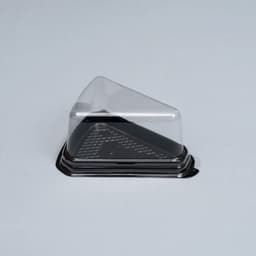 JB-03 is a premium triangular slice container for single-serve desserts, combining a crystal-clear PET dome lid with a rigid black PET base to showcase decorations while protecting delicate toppings with generous headroom; the tight snap-fit seal helps keep contents fresh and secure, the fine anti-slip textured base reduces sliding during transport, and reinforced ribs support stable stacking in bakery displays and delivery cartons, with a small lift tab for quick, hygienic opening and clean flat areas for branding, date, or barcode labels—ideal for cake slices, cheesecakes, tiramisu, mousse, and takeaway dessert programs; lid 14.0 × 11.15 × 6.8 cm, base 14.0 × 11.15 × 1.5 cm; packing 500 sets/pack (lid + base); made in Vietnam and suitable for export sourcing.