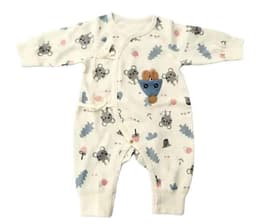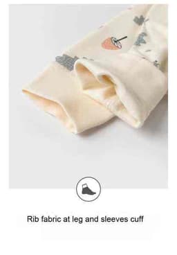 Made in Hanoi, Vietnam, this super-cute unisex baby romper features a soft knitted organic cotton/spandex fabric with snap-button closure and an adorable animal-themed print in ivory, offered with OEM/ODM service for international importers, distributors, and babywear brands sourcing reliable Vietnam-made infant apparel.