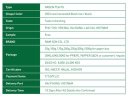 Ps Grade Green Tea Leaf is Vietnam-origin loose tea sourced from Phu Tho, Yen Bai, Ha Giang, and Lao Cai, offering a refreshing taste and consistent supply for importers, wholesalers, and private label packaging partners. Produced under ISO and HACCP systems and supported with Halal and Kosher compliance, it is available in retail paper boxes from 25g to 1000g or bulk 30–50kg PP&PE/paper sacks (custom packing on request), with export-scale loading of 8,000–24,000 kgs per 20/40HC container.