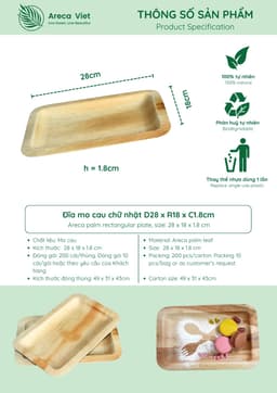 Made in Vietnam from natural areca palm sheath (mo cau), this rectangular plate offers a space-efficient serving format with a smooth surface and distinctive natural grain for a rustic premium look. The 28 × 18 × 1.8 cm size is well-suited for main dishes, snacks, desserts, and plated portions in catering, outdoor dining, and event service, providing a plastic-free, chemical-free alternative that supports sustainable foodservice sourcing and export programs.