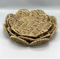 Made in Ninh Binh, Vietnam, this set of 3 handcrafted seagrass serving trays features a floral, petal-edge design and a nested structure for easy storage. Woven from dried, twisted seagrass with natural texture and earthy tones, it is ideal for importers and wholesalers supplying eco-conscious homeware, hospitality, and lifestyle retailers—perfect for serving, organizing, or decorative merchandising in boho/coastal collections.