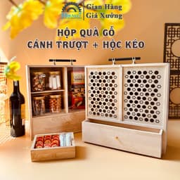 Made in Vietnam, this premium Tet gift box is designed as a mini cabinet with two sliding doors plus a spacious drawer, offering a distinctive “display cabinet” presentation for corporate gifting; ideal for packing tea, cookies, jam, coffee, mini wine, bird’s nest, and regional specialties, with adjustable inner dividers, metal gold-tone handles and latch, and optional logo/message engraving—also reusable after Tet for décor storage or office items (2 designs available: sliding mica doors or laser-cut wood doors).