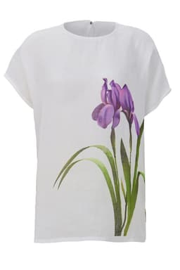 This thin short ramie shirt features an exclusive design by renowned designer Minh Hanh, crafted using digital printing technology with a round neckline, batwing sleeves, and side-slit hem for ease of movement; made from premium Vietnamese ramie fabric, the shirt offers excellent breathability, moisture absorption, and natural antibacterial properties, and is fully sourced and produced in Vietnam through a high-quality process from fiber production to weaving and dyeing, making it a refined choice for premium sustainable fashion collections.