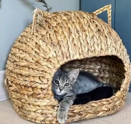 A handcrafted pet house made from natural water hyacinth in Vietnam, designed for importers and retailers sourcing eco-friendly pet accessories; available in customizable colors, with MOQ 100 pcs per style/size/color, packed 25 pcs per standard export carton, sample lead time ~7–10 days and production lead time ~40–50 working days after deposit, with shipment options by sea, air, or express (DHL/TNT/UPS/EMS/FedEx) and payment via T/T or L/C.