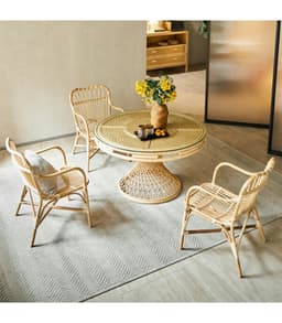 Manufactured in Vietnam, the All-Vine Dining Set is a tropical-style rattan dining solution designed for importers, wholesalers, and project buyers sourcing natural-material furniture. The set includes one round table featuring a handwoven rattan base with an easy-clean glass tabletop, paired with three matching rattan chairs shaped with supportive backrests and armrests for comfortable dining. Finished in a light beige tone and backed by a 12-month warranty, it’s a strong option for indoor dining spaces or covered outdoor hospitality settings that want a breezy, nature-forward look.