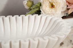 Barcione is a handcrafted artistic object sculpted from natural Snow White stone, distinguished by its pure white tone and finely balanced structure, featuring soft, evenly carved grooves that flow around the inner form to create a dynamic, fabric-like visual effect; meticulously shaped and polished by skilled artisans to preserve natural gloss while maintaining precise details, Barcione represents a refined fusion of traditional stone craftsmanship and contemporary aesthetics, making it a sophisticated decorative accent for luxury interiors such as living spaces, grand lobbies, and high-end showrooms, with overall dimensions of 220 × 450 × 100 mm.